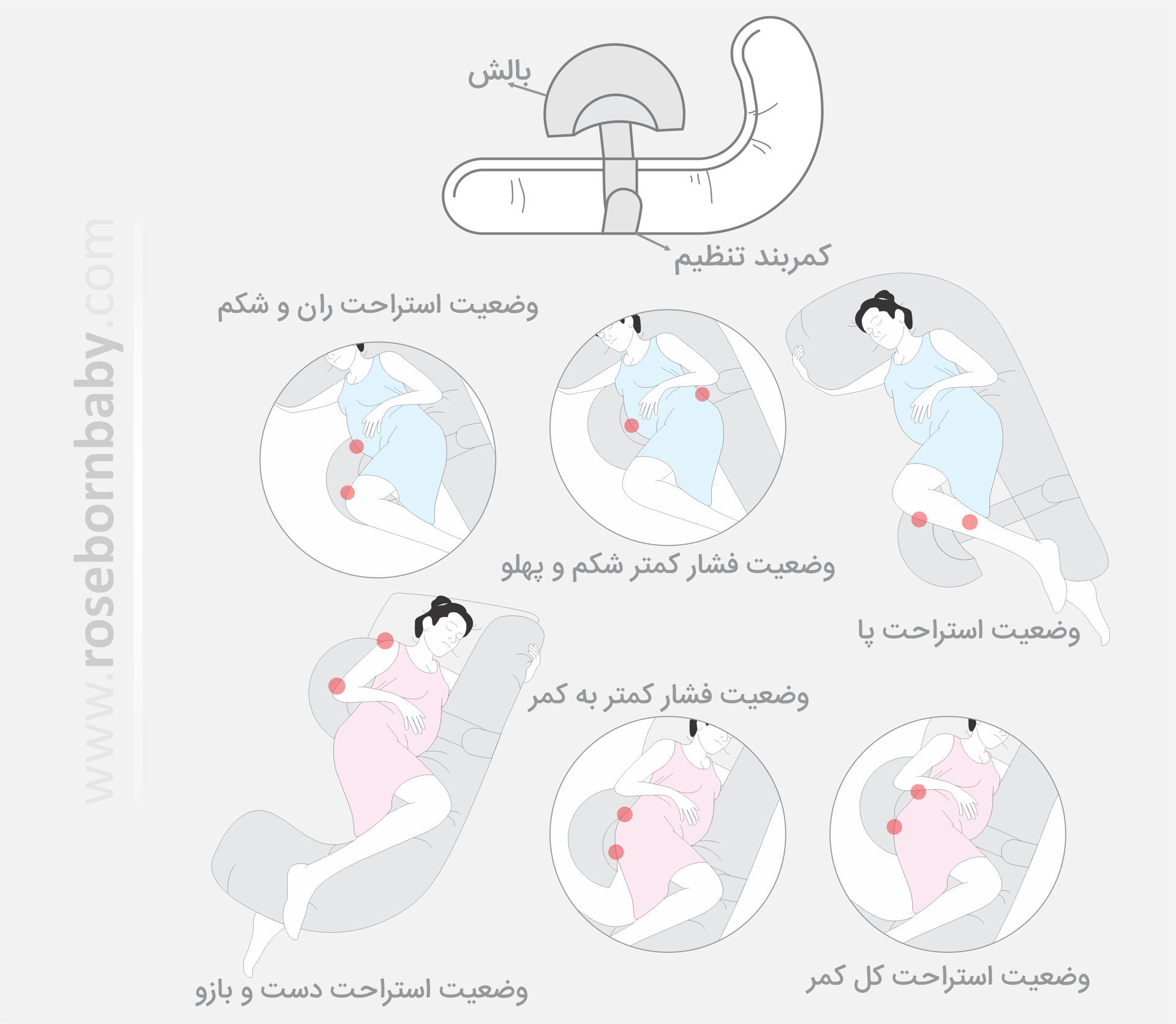 بالش بارداری roseborn با ابعاد استاندارد و ارگونومی خاص برای بدن مادران طراحی شده و برای دوران بارداری که شکم مادر روز به روز سنگین تر و فشار بیشتری به ستون فقرات وارد میکند قابل استفاده می باشد.